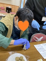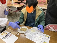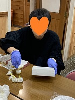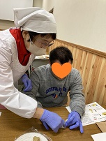 スタッフさんに教わりながら、生地を包んでキュッと絞って…